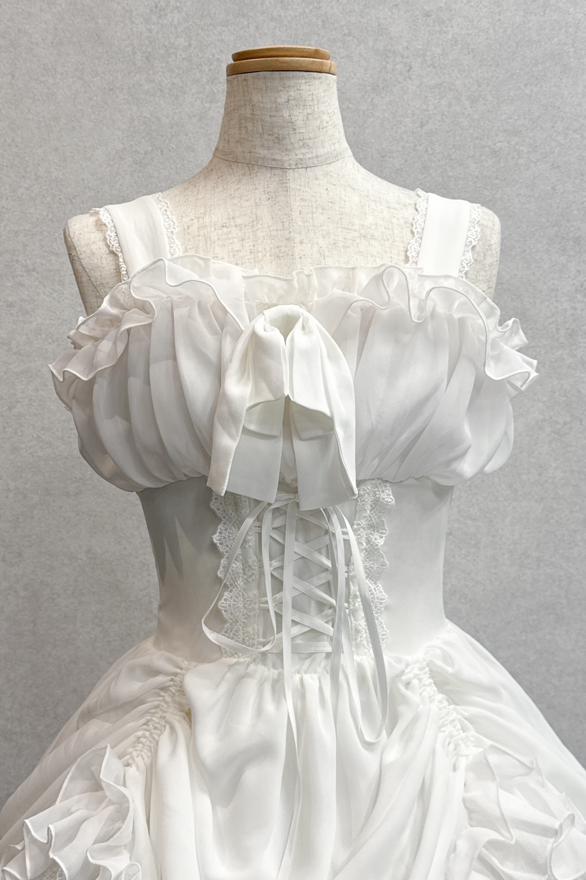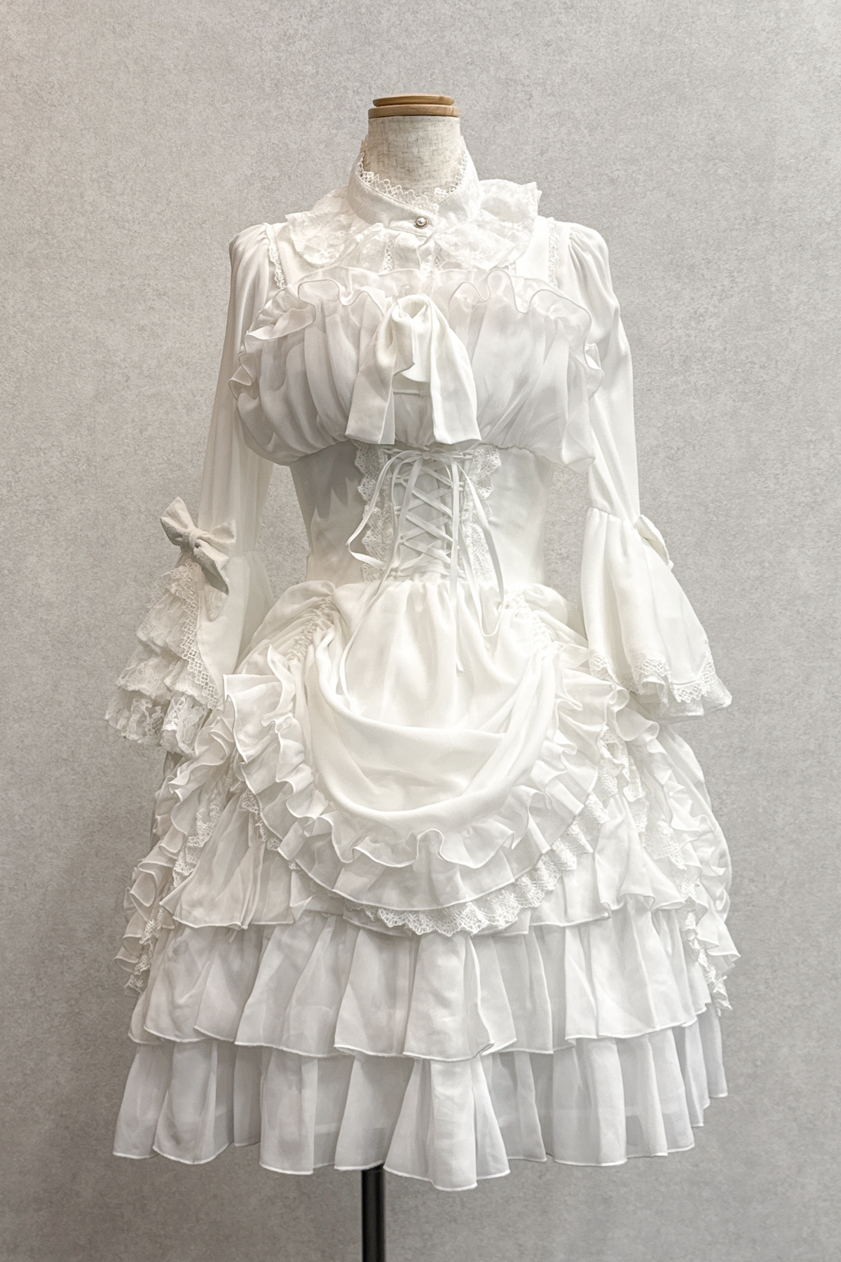 シフォン素材のゴスロリワンピース。スカートに4か所付いているドレープリボンを調節することで、バッスルのようなデザインにしたり、