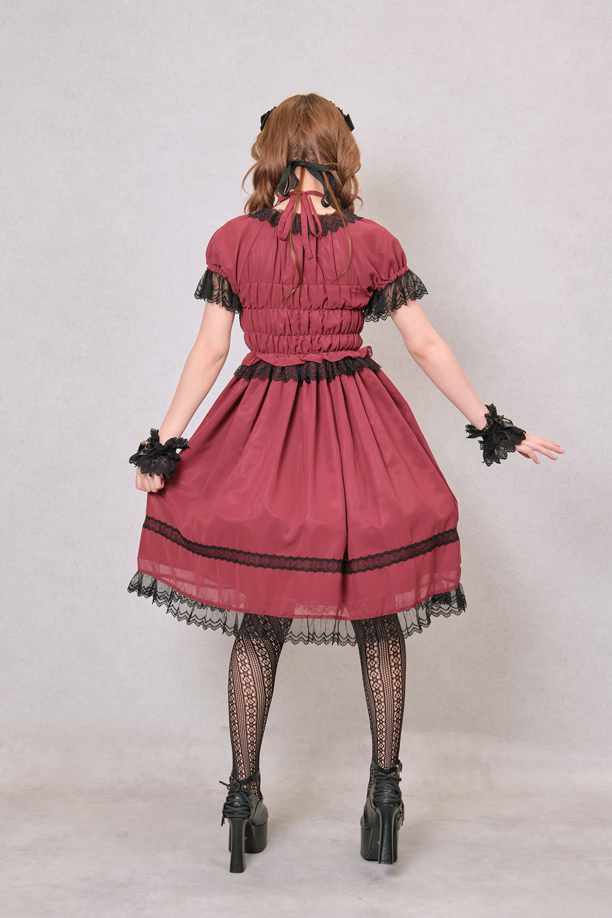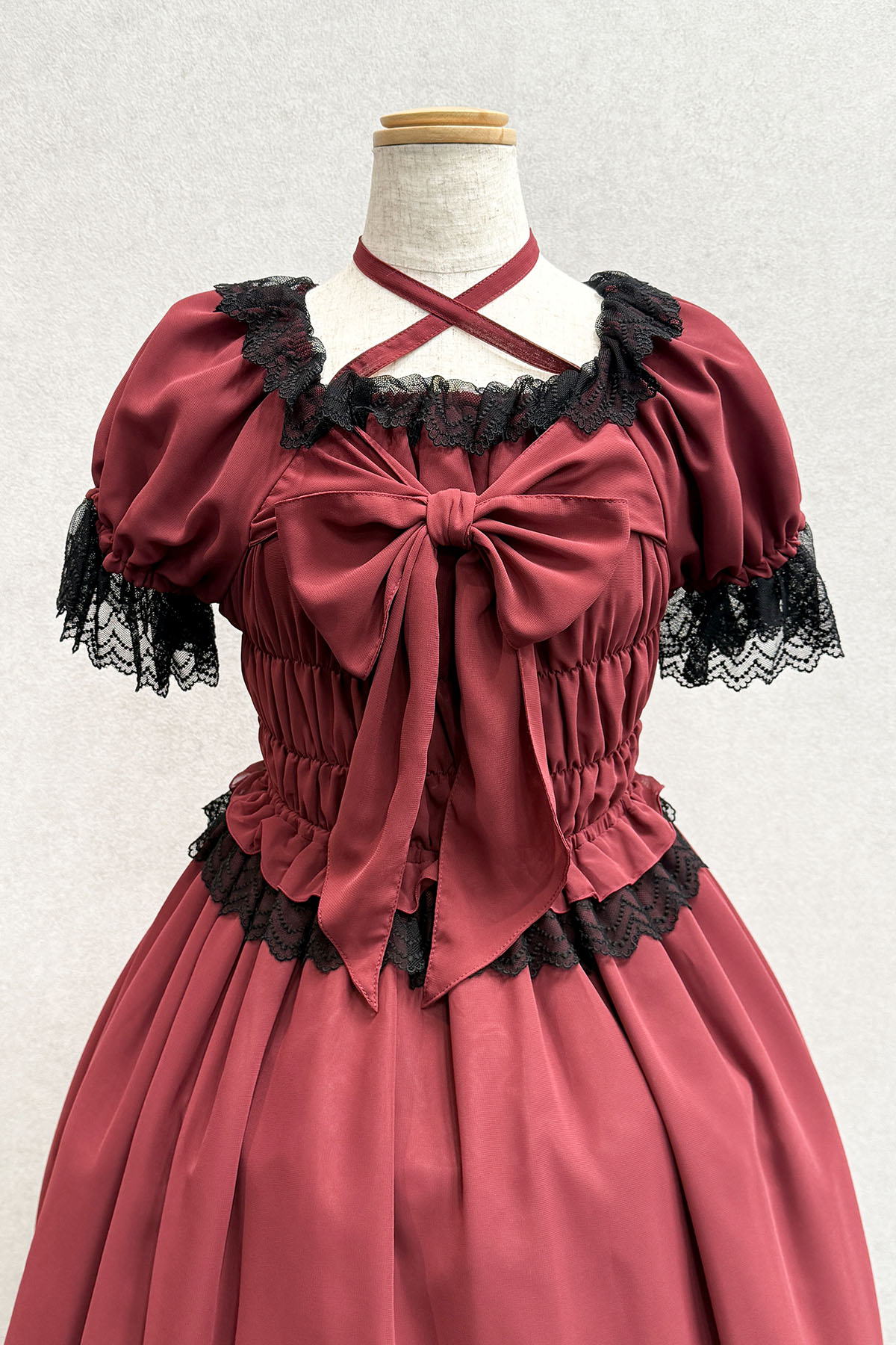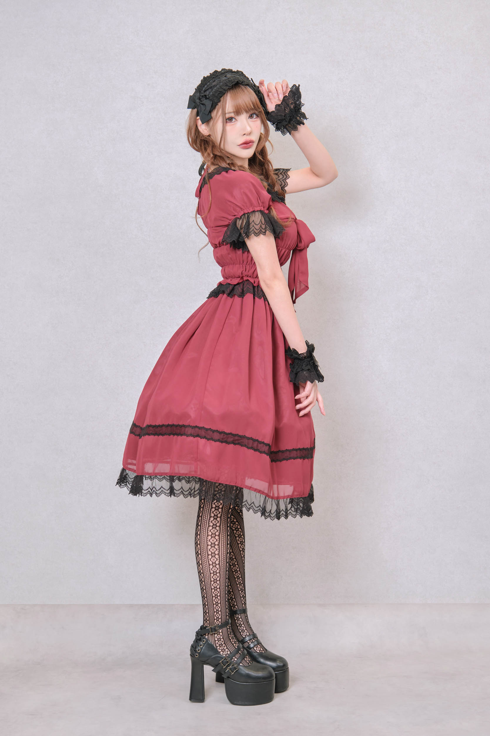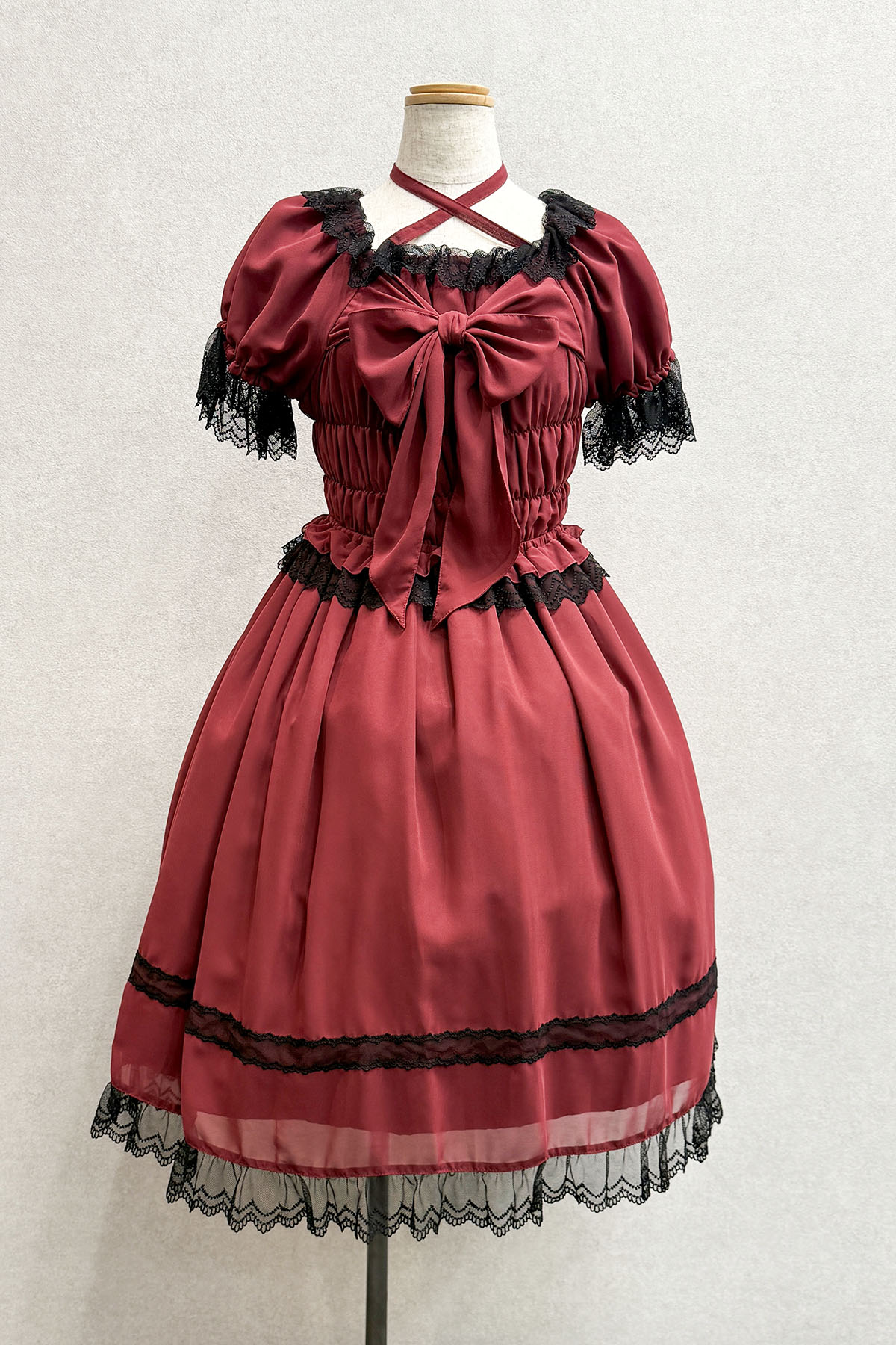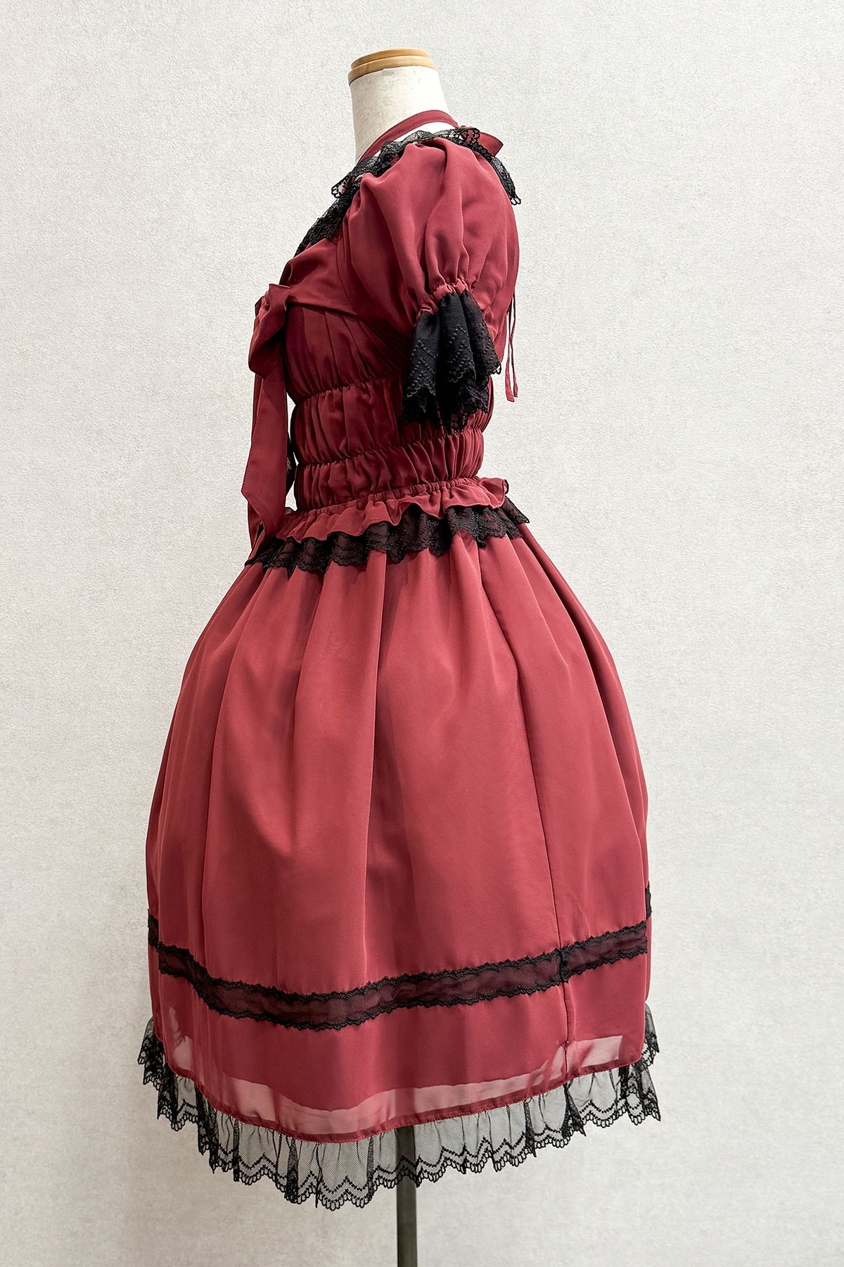 ゴシックな赤ワンピースシフォン素材で軽やかなので寒い時期はブラウスを重ねて年中着ていただけます。