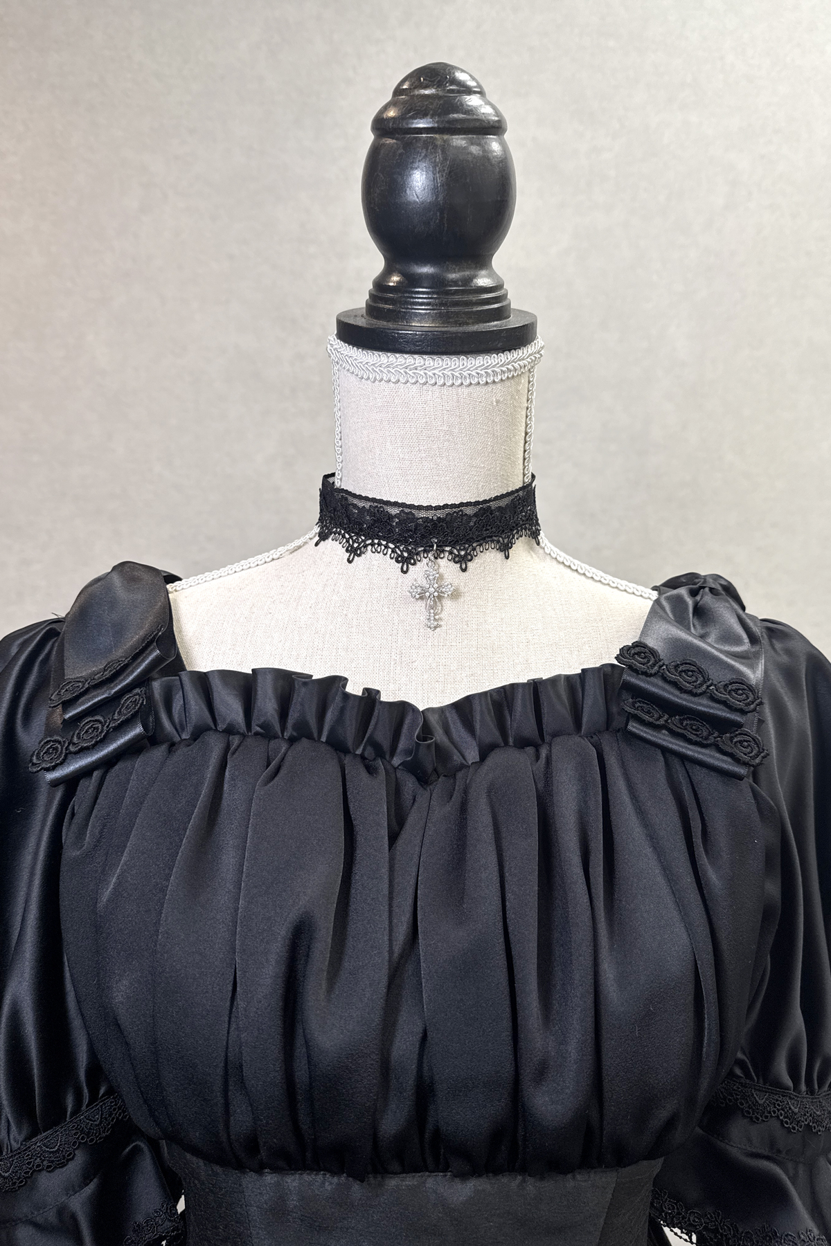 肩口には大きなリボンをあしらいゴシックで